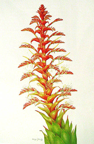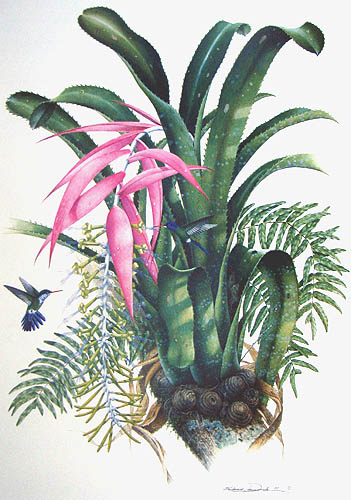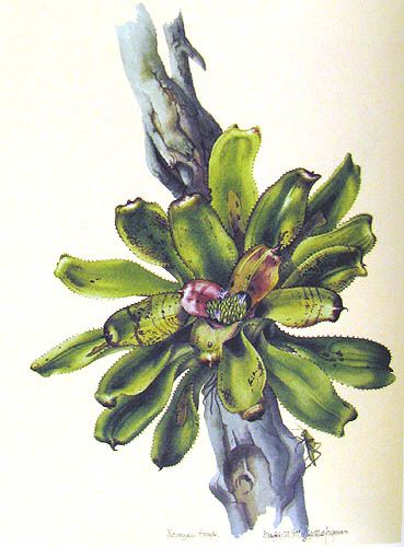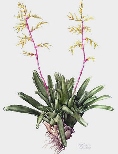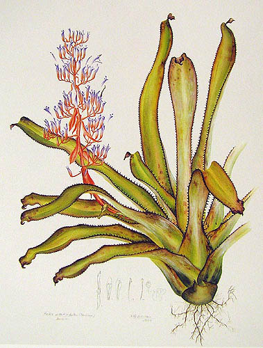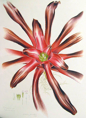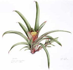 Botanical artists from the 20th centuryPresented here are some botanical paintings made since 1960. They are 'gathered' from different collections published in books (e.g. by Shirley Sherwood and Kew Gardens) or on the internet (e.g. Smithsonian Institution, artist web-sites). My aim is to give an idea of the illustrations of bromeliads made by the many botanical artists of recent and current date. |