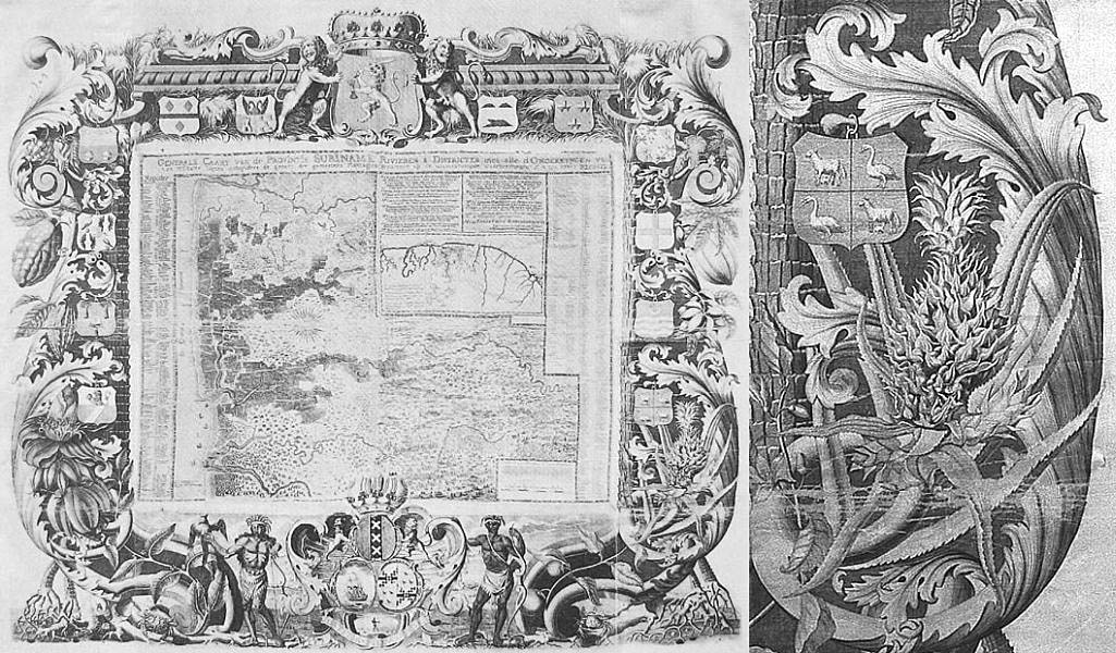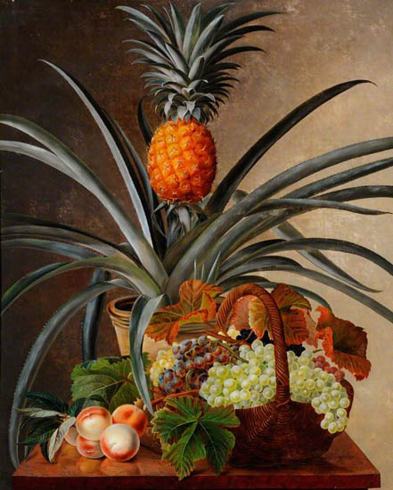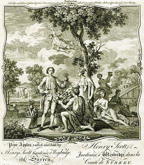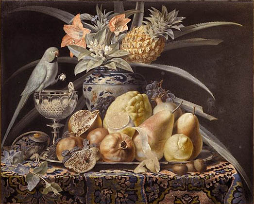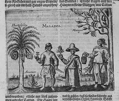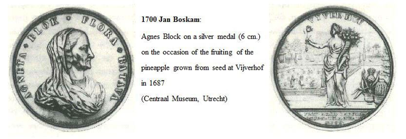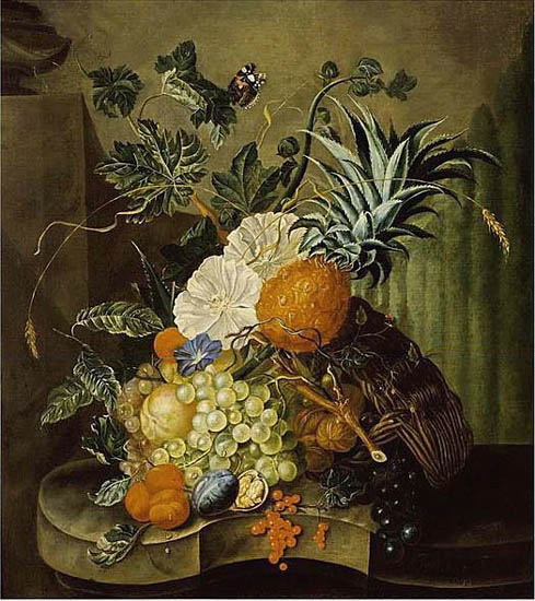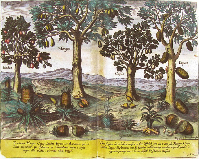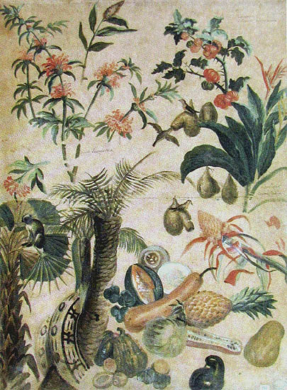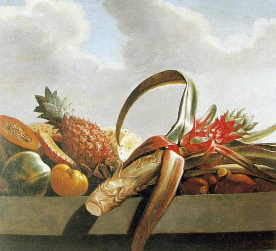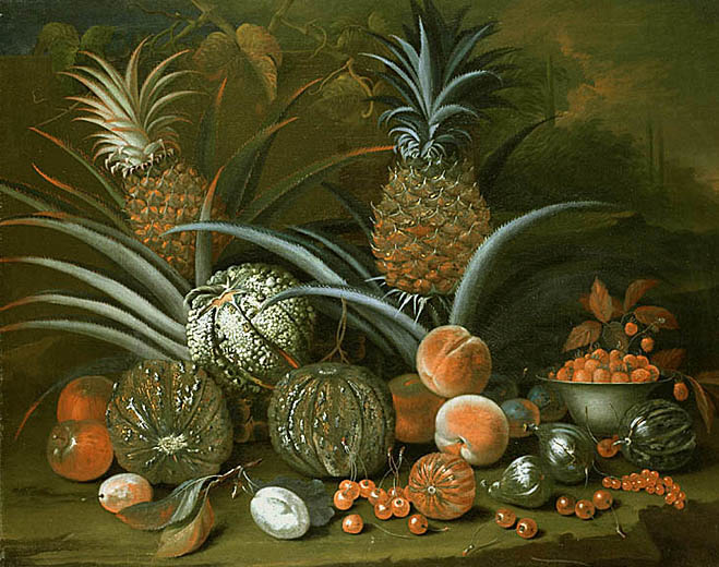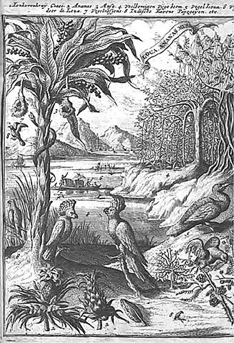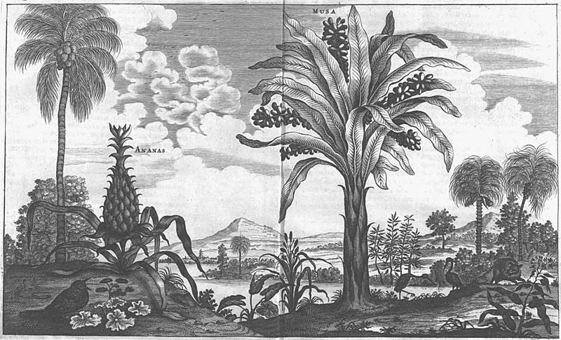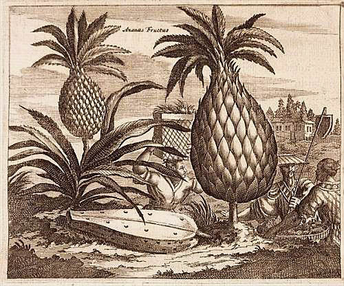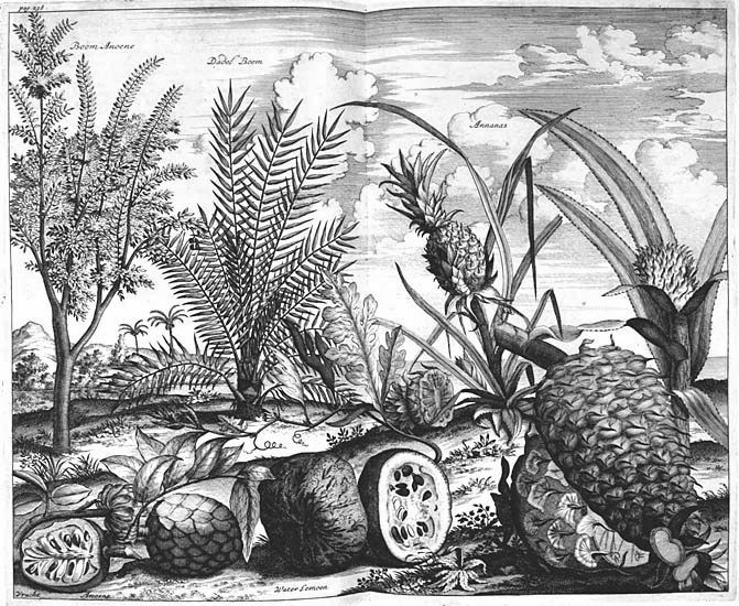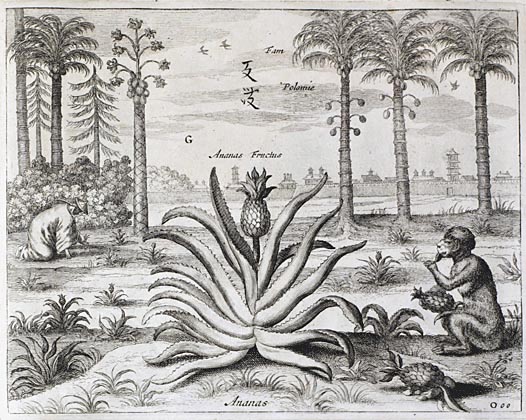 The pineapple figured in paintings and drawings etc.(search for the pineapple)1578 Jean de Léry: Histoire d'un voyage faict en la terre du Brésil, Tupinambá indians (l., wood engraving) related to (l.): undated from the Sloane volume of watercolours, associated with John White c.1540-1593 (r., British Museum) 1596 Jan Huygen van Linschoten: Itinerario, voyage ofte schipvaert van Jan Huygen van Linschoten naer Oost ofte Portugaels Indien (engraving by Johannis Baptista van Doetecum) 1621 Honorius Philiponus: Nova typis transacta navigatio, 'Carib Indians greet Europeans' (engraving) 1640 Albert Eckhout: Still life (l., oil on canvas, Nationalmuseet Copenhagen) c.1651-1663 Andries Beeckman: 'Still life with exotic fruit and a white cockatoo' (r., oil on canvas) 1648 Willem Piso: Historia Naturalis Brasiliae (l.) and 1658 Willem Piso: De Indiae utriusque re naturali et medica (r.) 1665 Johan Nieuhof: Het gezantschap der Neerlandtsche Oost-Indischen Compagnie aan den grooten Tartarischen Cham, den tegenwoordigen keizer van China - Algemeene beschryving van 't Ryk Sina following page 148 (engraving), also on tin-glazed earthenware Delft tile, 43,5 x 48 cm. at Dyrham Park, UK (National Trust) 1629 John Parkinson: Paradisi in Sole Paradisus Terrestris, titleplate by Christopher Switzer (l., engraving) c.1660-1670 anonymous: mural in castle Schwedt a.d. Oder, lost in WW2 (see also painting below) 1666 anonymous: 'Oost-Indisch marktstalletje' (oil on canvas, Rijksmuseum) 1652, 1650 Frans Post: details of paintings (oil on canvas, Rijksmuseum Amsterdam (l.) and Historisches Museum Frankfurt (r.)) 1662 Frans Post: 'Gezicht op Olinda' (oil on canvas, Rijksmuseum) 1667 Athanasius Kircher: China Monumentis Illustrata, page 188 (l.) and page 189 (r.) 1666 Sir Christopher Wren: design of St. Paul's Cathedral with elongated pineapple, not executed (l., All Souls College, Oxford) c.1685-1710: pineapple on the towers of present St. Paul's Cathedral, London (m. and r.) c.1675 anonymous: 'John Rose, the royal gardener, presenting a pineapple to king Charles II' (oil on canvas) 1668 Olfert Dapper: Naukeurige beschrijvinge der Afrikaensche gewesten, page 348 (l.) 1682 Simon de Vries: Curieuse aenmerckingen der bysonderste Oost- en Westindische verwonderens-waerdige dingen, plate after page 130 (r.) 1682 Johan Nieuhof: Joan Nieuhofs gedenkwaerdige zee en lantreize door de voornaemste landschappen van West en Oostindien, titleplate (l.) and plate after page 238 of part 2 (r.) 1689-1690 after Albert Eckhout: detail of 'L'Éléphant' from 'Tenture des Indes', Manifacture des Gobelins (l., tapistry, Mobilier National Paris) 1692-1693 François Desportes after Albert Eckhout: drawings for tapistries (r., oil on paper, Cité de la Céramique, Sèvres) c.1690 Jan Weenix: 'Agnes Block, Sybrand de Flines and two children at the country seat Vijverhof' (oil on canvas, Amsterdam Museum) c.1690-1699 Jan Weenix: 'Portrait of a young woman and a little girl' (l., oil on canvas) 17th century anonymous: gilded silver cup, 22,5 x 6,5 cm. (r., Musée des Beaux-Arts de Lille) 1690 anonymous (English school): 'Farming large pineapples', from a description of embassies to China (l., engraving) 1696 Jürgen Andersen: Orientalische Reise-Beschreibung, page 82 (r., engraving) 1692 Bartholomeus Brandon: titleplate of Hortus Regius Honselaerdicensis (l., vellum in drawing-book, Biblioteca Nazionale Centrale di Firenze) 1705 Georg Eberhard Rumphius: D'Amboinsche Rariteitenkamer vol.1, portrait by his son P.A. Rumphius, engraving by Jacobus de Later (r.) 1697 Jan Commelin: Horti Medici Amstelodamensis, vol.1 titleplate from several copies showing differences in coloring (copper engraving) c.1696 Philip Tideman: 'Allegory of America' (drawing on paper) c.1690-1705: 'La récolte des ananas' from 'L'Histoire de l'empereur de la Chine', Manifacture Beauvais (tapistry, J. Paul Getty Museum Los Angeles) 1719 Maria Sibylla Merian: Over de voortteeling en wonderbaerlyke veranderingen der Surinaemsche insecten, titleplate by Frederik Ottens (engraving). 1737 Alexander de Lavaux & J.G. de Lacroix: Chart of Suriname (print on silk, 186x215 cm, Rijksmuseum Amsterdam). 1721 Rudolf and Gerard Wetstein: Het Brittanische rijk in Amerika, translation of 1708 John Oldmixon: The British empire in America, added engraving by Jan Goeree (l.) 1742 Gaetano Monti: Jacobi Zanonii rariorum stirpium historia, edition of 1675 Giacomo Zanoni: Istoria Botanica (added engraving, r.) 1748 Jorge Juan & Antonio de Ulloa: Relación Histórica del viage a la América Meridional pt.1 book1 1732 Robert Furber: Twelve months of fruits - october, drawing by Pieter Casteels (l., engraving) 1742 Jan van Huysum: Still life (r., oil on copper, National Trust) c.1734-1783 Frans van der Mijn: 'Two parrots and some fruit' (l., oil on canvas) c.1745 Joseph Anton Glantschnig: Europa und Asien (r., oil on canvas, Mainfränkisches Museum Würzburg) 1750 after Peter Babel: Trade-card of Negri and Wetten, confectioners at the Pineapple, Berkeley Square, London (l., etching/engraving, paper, print by Ignatius Fougeron) 1754 : Draft of trade-card of Henry Scott, gardener, of Weybridge, Surrey (r., paper, print by Francis Vivares) 1740 Nicolaas Verkolje: 'David van Mollem at his estate Zijdebalen near Utrecht' (l., oil on wood) 1775-1799 anonymous (Dutch school): decoration on wall over door (r., oil on canvas) c.1774-1777 Jan van Os: Still life (oil on canvas) 1779 Gerard van Spaendonck: Still life (l., oil on canvas) 1795 Corneille van Spaendonck: Still life (r., oil on canvas) 1761 The pineapple at Dunmore Park (l., photo National Trust) 1775 after C.S. Blake: 'James Sibbald, gardener to Thomas Delaval' (r.) 1781 after Jean Michel Moreau le Jeune, engraving by Isidore Stanislas Helman: 'Le souper fin' (l., Musée Carnavalet, Paris) 1783 Charles Bretherton: 'Mrs. Weltje in her shop in Pall Mall' (r., engraving) 1763 Miguel Cabrera: Casta painting from Mexico (l., oil on canvas). c.1775-18