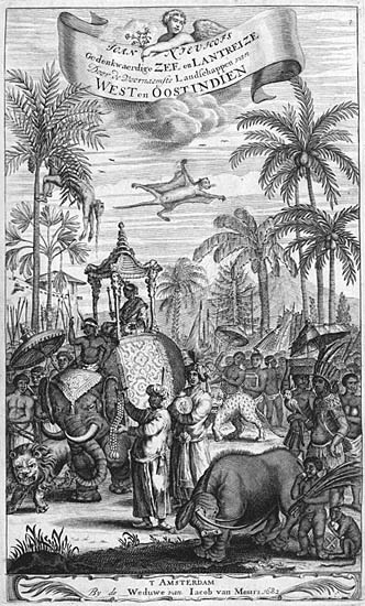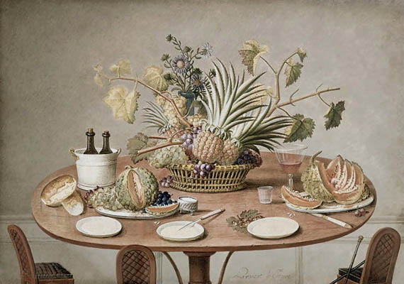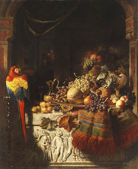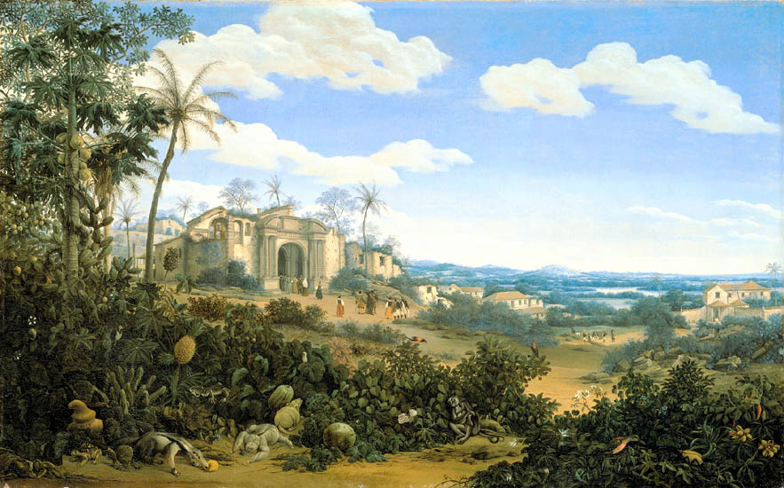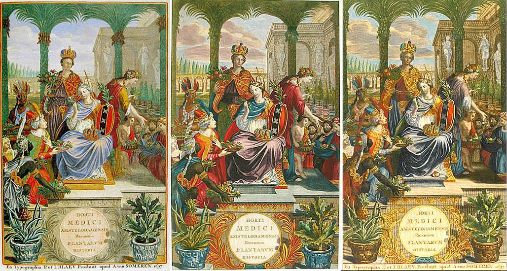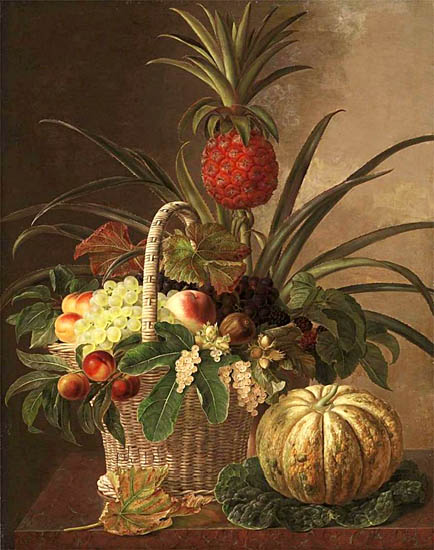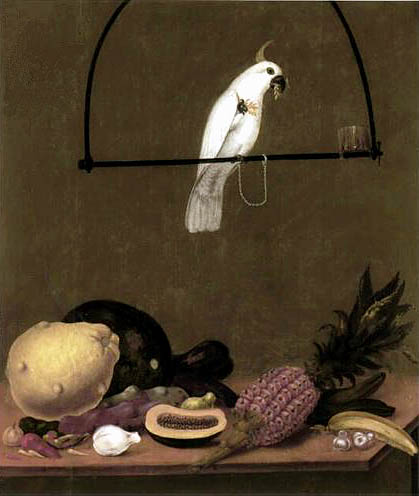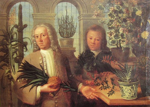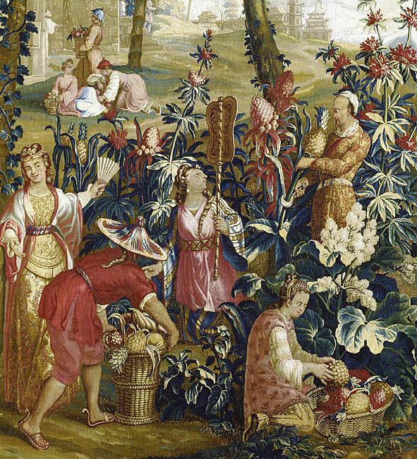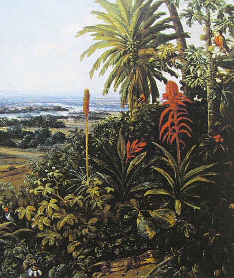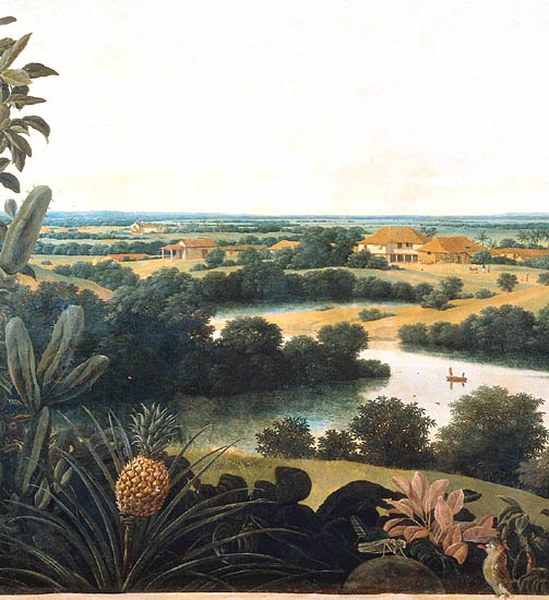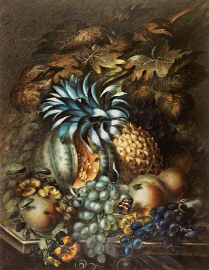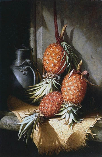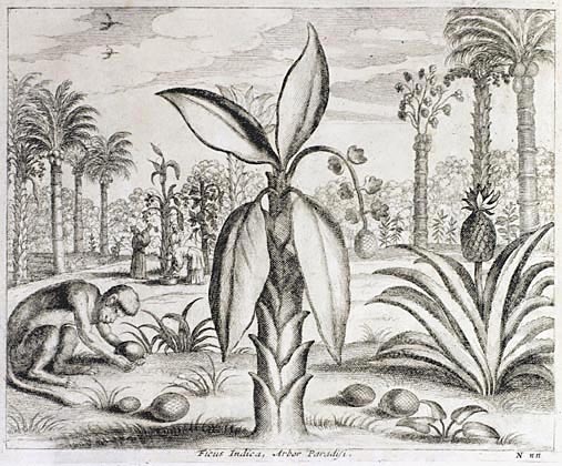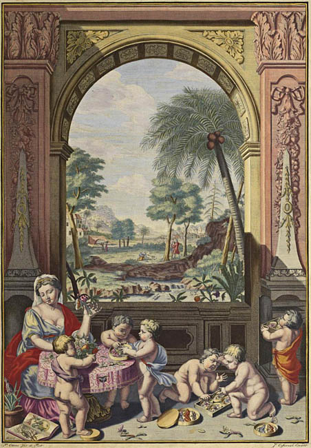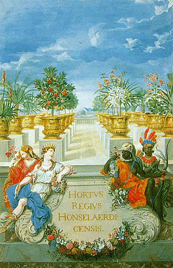 The pineapple figured in paintings and drawings etc.(search for the pineapple)1578 Jean de Léry: Histoire d'un voyage faict en la terre du Brésil, Tupinambá indians (l., wood engraving) related to (l.): undated from the Sloane volume of watercolours, associated with John White c.1540-1593 (r., British Museum) 1596 Jan Huygen van Linschoten: Itinerario, voyage ofte schipvaert van Jan Huygen van Linschoten naer Oost ofte Portugaels Indien (engraving by Johannis Baptista van Doetecum) 1621 Honorius Philiponus: Nova typis transacta navigatio, 'Carib Indians greet Europeans' (engraving) 1640 Albert Eckhout: Still life (l., oil on canvas, Nationalmuseet Copenhagen) c.1651-1663 Andries Beeckman: 'Still life with exotic fruit and a white cockatoo' (r., oil on canvas) 1648 Willem Piso: Historia Naturalis Brasiliae (l.) and 1658 Willem Piso: De Indiae utriusque re naturali et medica (r.) 1665 Johan Nieuhof: Het gezantschap der Neerlandtsche Oost-Indischen Compagnie aan den grooten Tartarischen Cham, den tegenwoordigen keizer van China - Algemeene beschryving van 't Ryk Sina following page 148 (engraving), also on tin-glazed earthenware Delft tile, 43,5 x 48 cm. at Dyrham Park, UK (National Trust) 1629 John Parkinson: Paradisi in Sole Paradisus Terrestris, titleplate by Christopher Switzer (l., engraving) c.1660-1670 anonymous: mural in castle Schwedt a.d. Oder, lost in WW2 (see also painting below) 1666 anonymous: 'Oost-Indisch marktstalletje' (oil on canvas, Rijksmuseum) 1652, 1650 Frans Post: details of paintings (oil on canvas, Rijksmuseum Amsterdam (l.) and Historisches Museum Frankfurt (r.)) 1662 Frans Post: 'Gezicht op Olinda' (oil on canvas, Rijksmuseum) 1667 Athanasius Kircher: China Monumentis Illustrata, page 188 (l.) and page 189 (r.) 1666 Sir Christopher Wren: design of St. Paul's Cathedral with elongated pineapple, not executed (l., All Souls College, Oxford) c.1685-1710: pineapple on the towers of present St. Paul's Cathedral, London (m. and r.) c.1675 anonymous: 'John Rose, the royal gardener, presenting a pineapple to king Charles II' (oil on canvas) 1668 Olfert Dapper: Naukeurige beschrijvinge der Afrikaensche gewesten, page 348 (l.) 1682 Simon de Vries: Curieuse aenmerckingen der bysonderste Oost- en Westindische verwonderens-waerdige dingen, plate after page 130 (r.) 1682 Johan Nieuhof: Joan Nieuhofs gedenkwaerdige zee en lantreize door de voornaemste landschappen van West en Oostindien, titleplate (l.) and plate after page 238 of part 2 (r.) 1689-1690 after Albert Eckhout: detail of 'L'Éléphant' from 'Tenture des Indes', Manifacture des Gobelins (l., tapistry, Mobilier National Paris) 1692-1693 François Desportes after Albert Eckhout: drawings for tapistries (r., oil on paper, Cité de la Céramique, Sèvres) c.1690 Jan Weenix: 'Agnes Block, Sybrand de Flines and two children at the country seat Vijverhof' (oil on canvas, Amsterdam Museum) c.1690-1699 Jan Weenix: 'Portrait of a young woman and a little girl' (l., oil on canvas) 17th century anonymous: gilded silver cup, 22,5 x 6,5 cm. (r., Musée des Beaux-Arts de Lille) 1690 anonymous (English school): 'Farming large pineapples', from a description of embassies to China (l., engraving) 1696 Jürgen Andersen: Orientalische Reise-Beschreibung, page 82 (r., engraving) 1692 Bartholomeus Brandon: titleplate of Hortus Regius Honselaerdicensis (l., vellum in drawing-book, Biblioteca Nazionale Centrale di Firenze) 1705 Georg Eberhard Rumphius: D'Amboinsche Rariteitenkamer vol.1, portrait by his son P.A. Rumphius, engraving by Jacobus de Later (r.) 1697 Jan Commelin: Horti Medici Amstelodamensis, vol.1 titleplate from several copies showing differences in coloring (copper engraving) c.1696 Philip Tideman: 'Allegory of America' (drawing on paper) c.1690-1705: 'La récolte des ananas' from 'L'Histoire de l'empereur de la Chine', Manifacture Beauvais (tapistry, J. Paul Getty Museum Los Angeles) 1719 Maria Sibylla Merian: Over de voortteeling en wonderbaerlyke veranderingen der Surinaemsche insecten, titleplate by Frederik Ottens (engraving). 1737 Alexander de Lavaux & J.G. de Lacroix: Chart of Suriname (print on silk, 186x215 cm, Rijksmuseum Amsterdam). 1721 Rudolf and Gerard Wetstein: Het Brittanische rijk in Amerika, translation of 1708 John Oldmixon: The British empire in America, added engraving by Jan Goeree (l.) 1742 Gaetano Monti: Jacobi Zanonii rariorum stirpium historia, edition of 1675 Giacomo Zanoni: Istoria Botanica (added engraving, r.) 1748 Jorge Juan & Antonio de Ulloa: Relación Histórica del viage a la América Meridional pt.1 book1 1732 Robert Furber: Twelve months of fruits - october, drawing by Pieter Casteels (l., engraving) 1742 Jan van Huysum: Still life (r., oil on copper, National Trust) c.1734-1783 Frans van der Mijn: 'Two parrots and some fruit' (l., oil on canvas) c.1745 Joseph Anton Glantschnig: Europa und Asien (r., oil on canvas, Mainfränkisches Museum Würzburg) 1750 after Peter Babel: Trade-card of Negri and Wetten, confectioners at the Pineapple, Berkeley Square, London (l., etching/engraving, paper, print by Ignatius Fougeron) 1754 : Draft of trade-card of Henry Scott, gardener, of Weybridge, Surrey (r., paper, print by Francis Vivares) 1740 Nicolaas Verkolje: 'David van Mollem at his estate Zijdebalen near Utrecht' (l., oil on wood) 1775-1799 anonymous (Dutch school): decoration on wall over door (r., oil on canvas) c.1774-1777 Jan van Os: Still life (oil on canvas) 1779 Gerard van Spaendonck: Still life (l., oil on canvas) 1795 Corneille van Spaendonck: Still life (r., oil on canvas) 1761 The pineapple at Dunmore Park (l., photo National Trust) 1775 after C.S. Blake: 'James Sibbald, gardener to Thomas Delaval' (r.) 1781 after Jean Michel Moreau le Jeune, engraving by Isidore Stanislas Helman: 'Le souper fin' (l., Musée Carnavalet, Paris) 1783 Charles Bretherton: 'Mrs. Weltje in her shop in Pall Mall' (r., engraving) 1763 Miguel Cabrera: Casta painting from Mexico (l., oil on canvas). c.1775-18