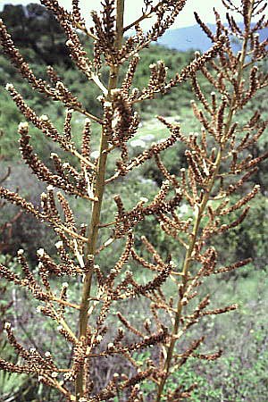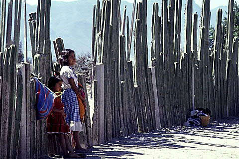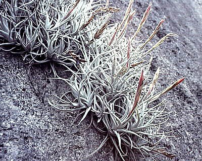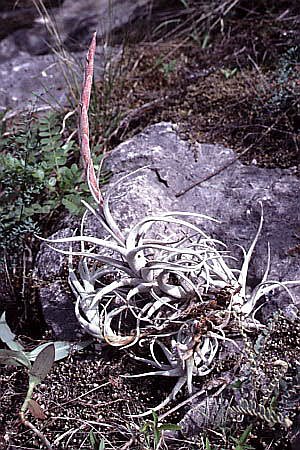 MexicoMitla and El TuleThe small town of Mitla is especially known for the ruins of the religious centers of the Zapotec and Mixtec civilizations. The image here depicts the "Patio de Mosaicos". In the area one can find a saxicolous Tillandsia-species named after the location: Tillandsia mitlaensis.On the road from Oaxaca to Mitla one passes El Tule, renowned for a kind of cypress called "ahuehuete". It is said to be the largest single biomass on earth, the tree measures 58 meters around and is more than 2000 years old. Turning your back to it, in the distance about 2 kilometers away a grey and white rock-formation can be seen. Cross the road, wade through a little stream and head for the rocks. After passing a refuse dump you are not far from an encounter with Tillandsia mitlaensis var. tulensis, a stem-forming variety of this saxicole species. Here also grows the terrestrial bromeliad Hechtia pringlei. |